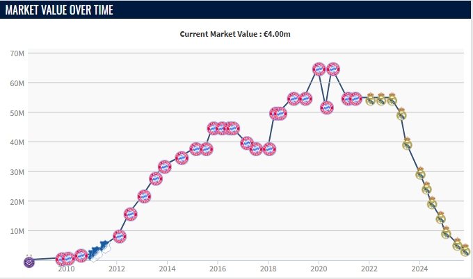 2021年夏窗阿拉巴与拜仁条约到期,随后目田身加盟皇马,29岁的他在皇马也夺得了不少冠军。30岁时阿拉巴身价尚有5500万欧,但受伤病影响,只是3年便降到只剩400万欧,跌回了领先忽闪霍村之时的身价。