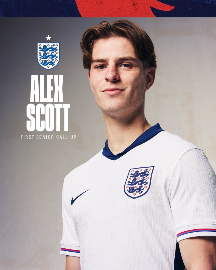 英格兰队公布新一期名单,伯恩茅斯22岁中场斯科特初度入选,英格兰队官方社媒晒出斯科特的海报,对他默示祝福。