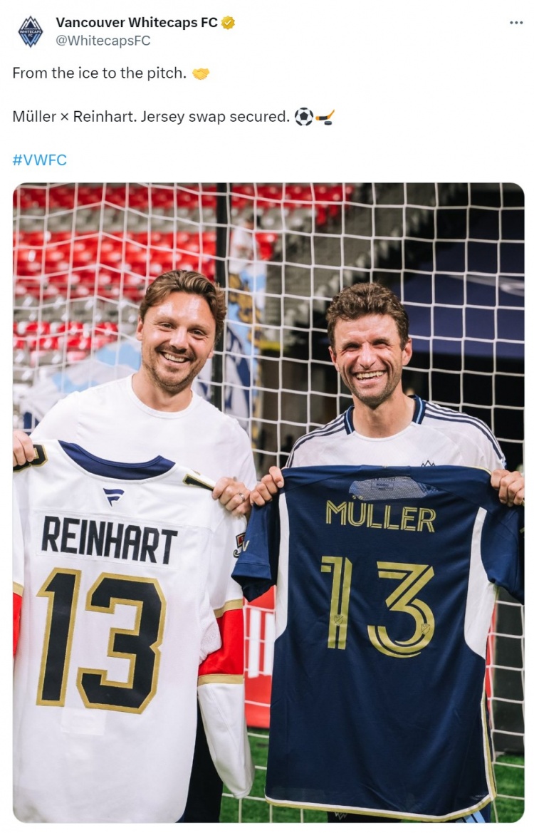 穆勒与效率于NHL佛罗里达好意思洲豹的加拿大冰球指点员莱因哈特碰面,并互换球衣,温哥华白浪社媒晒出两东谈主的合照,配文:“从冰场到球场,穆勒X莱因哈特,互换球衣。”