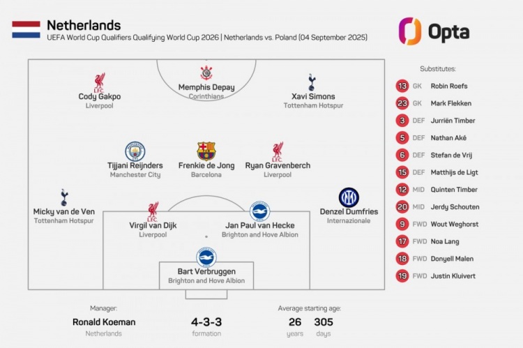 英超8将出战!荷兰队史初次首发有8东谈主齐来自合并国际联赛