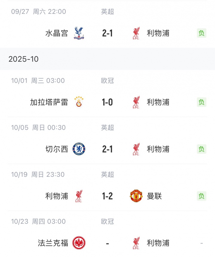 10月20日讯 利物浦主场1-2不敌曼联,遇到各项赛事4连败,而如若周中欧冠客场再负法兰克福,利物浦将遇到自1953年9月以来的初度五连败。