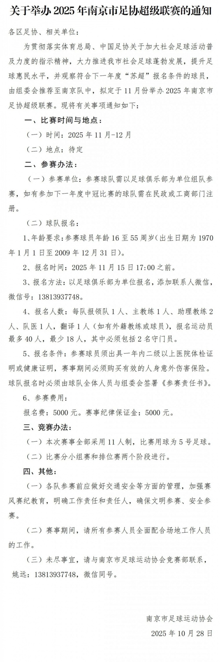 10月28日讯 当天,南京足协发布音讯,拟定于2025年11月举办南京市足协超等联赛,旨在鼓动城市社会足球茁壮发展,并不雅察顺应下一年度“苏超”报名要求的球员。