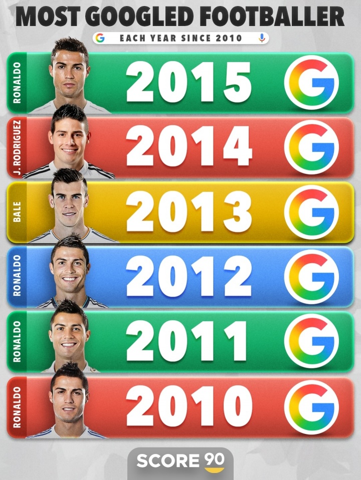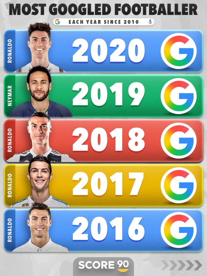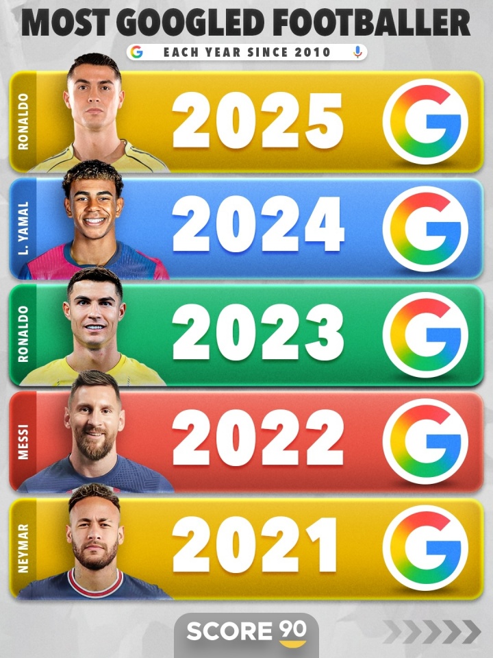 近15年谷歌搜索量最高球员榜:C罗10规律一霸榜,梅西22年登顶