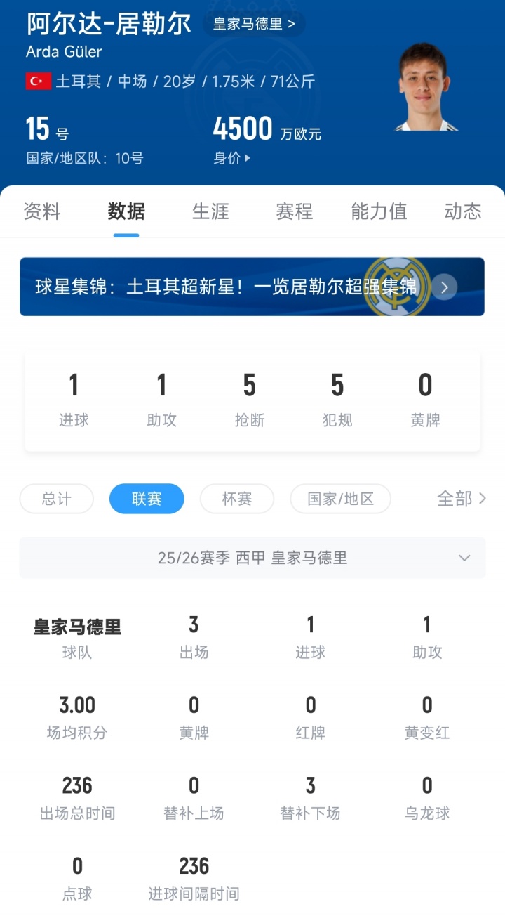 20岁的土耳其中场居勒尔,2023年夏窗以2400万欧元的转会费从费内巴切加盟皇马,签约至2029年。现在居勒尔的德回身价为4500万欧元。