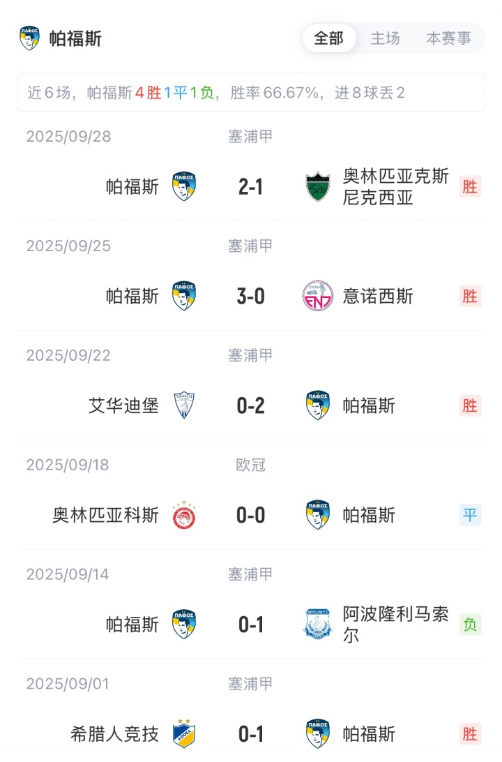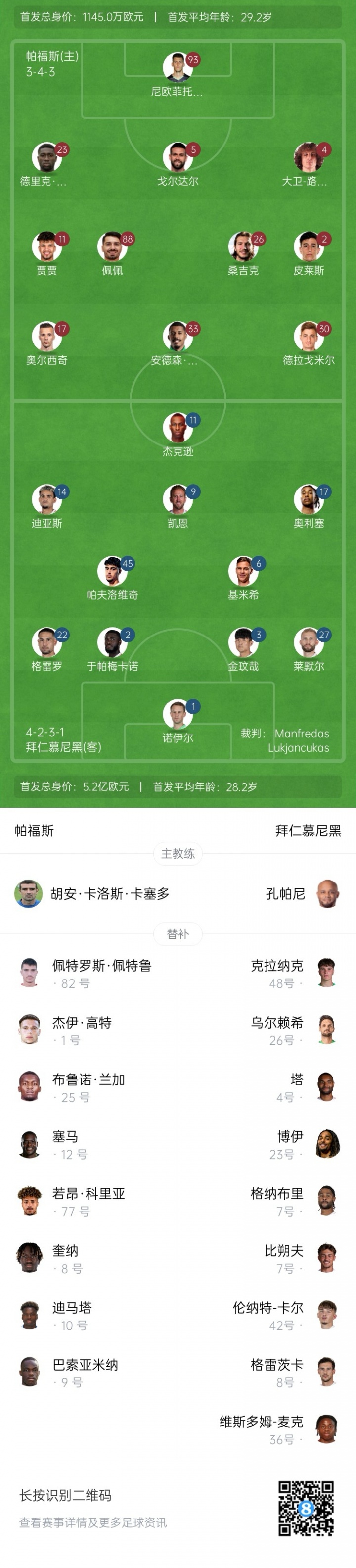 帕福斯首发:93-迈克尔、23-卢卡森、5-戈尔达尔、4-大卫·路易斯、11-贾贾、88-佩佩、26- 桑吉克、2-皮莱斯、17-奥尔西奇、33-安德森、30-德拉戈米尔