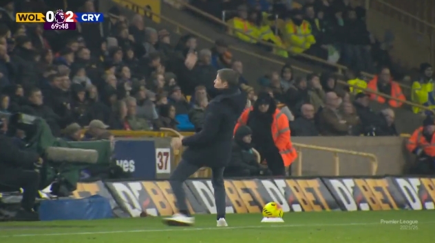 水晶宫不才半场6分钟2球完胜狼队,主帅格拉斯纳在场边情谊庆祝第二球时差点滑倒,随后他趁势转圈合手拳饱读劲。