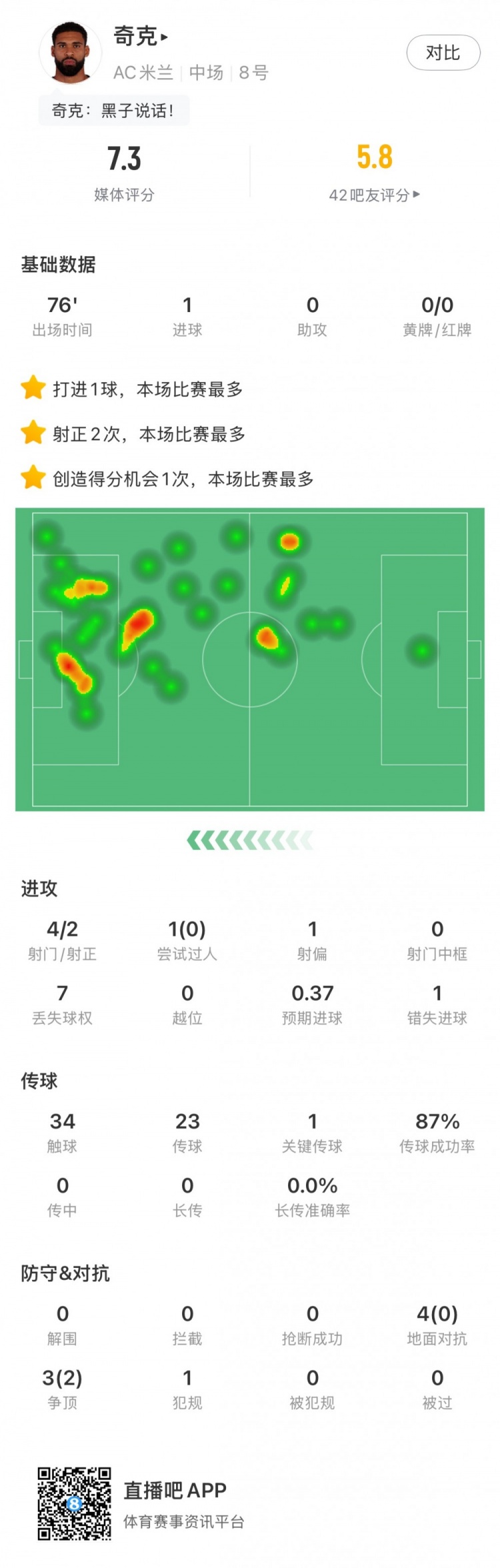 奇克本场数据:1个进球,1次要津传球,错失1次进球契机,评分7.3