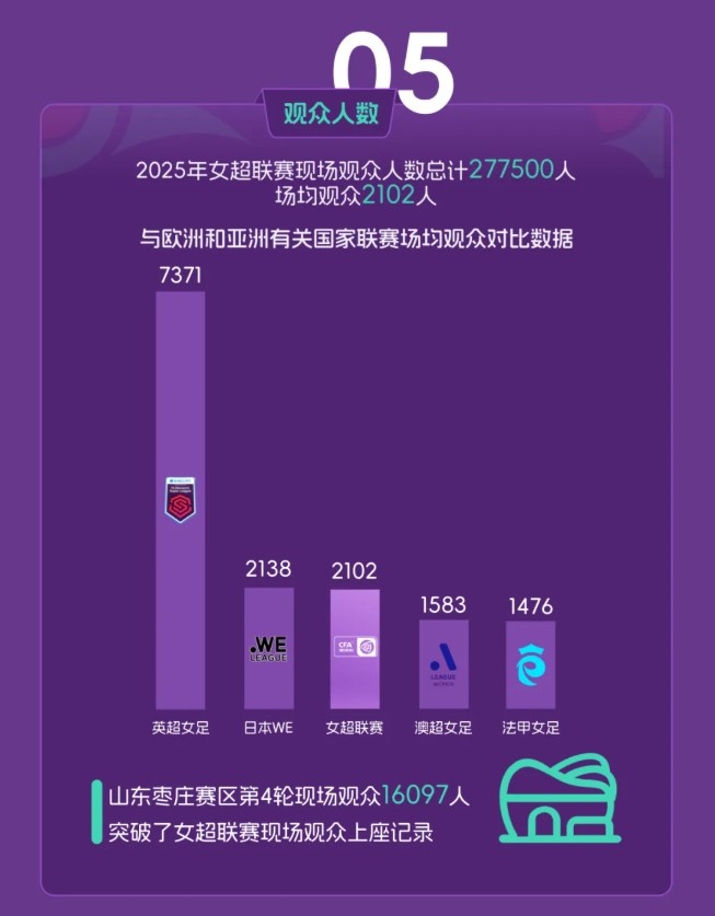 2025年女超联赛现场不雅世东说念主数共计277500东说念主,场均不雅众2102东说念主,在亚洲范畴仅次于日本WE联赛。