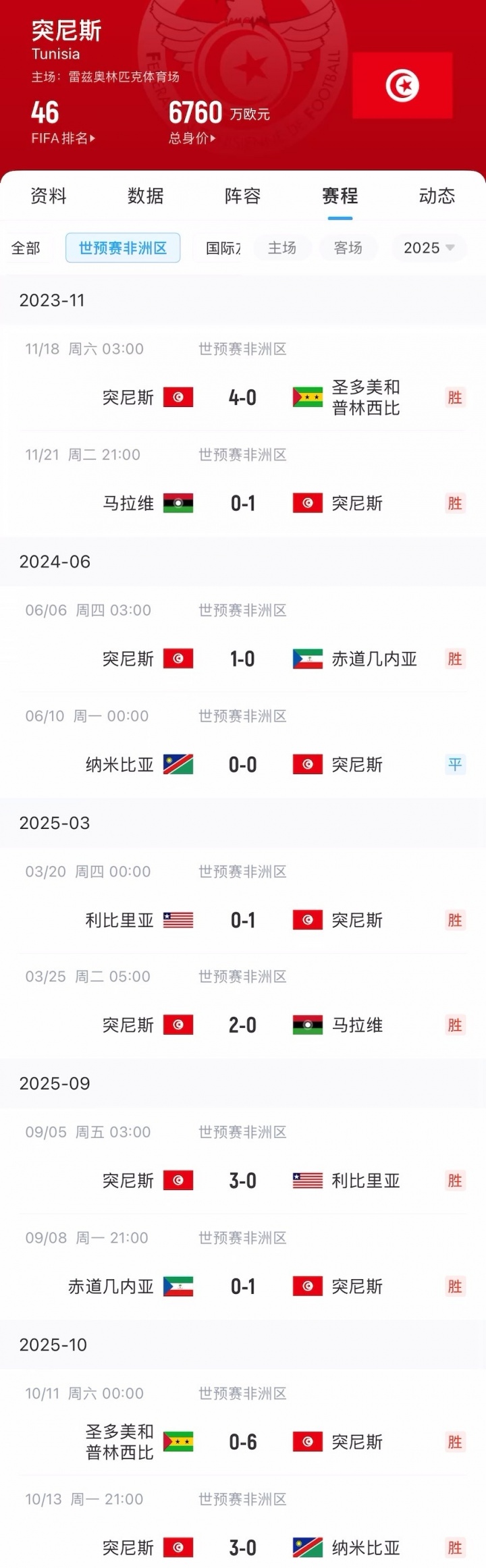 无敌!突尼斯世初赛10战0丢球 9胜1平豪取28分早早锁定寰球杯门票