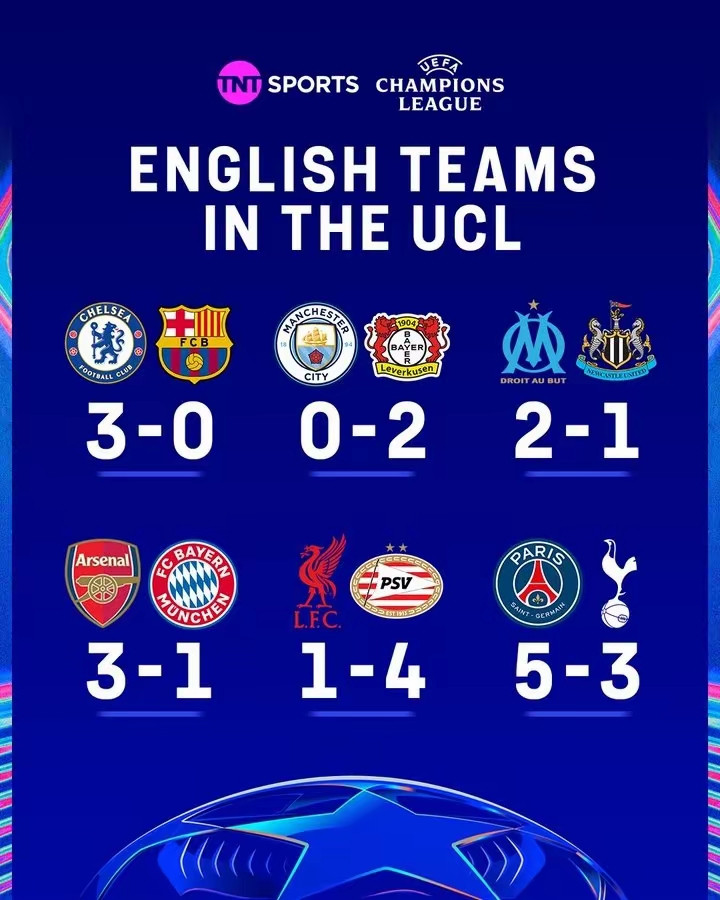 英超和法甲一共有6场比赛,由于法甲只好3队参赛,证据规定,这是“满额”的安排,不能能更多了。照旧完成的4场比赛中,曼城和热刺齐战平摩纳哥,以及本轮的热刺负于巴黎圣日耳曼,纽卡斯尔负于马赛。英超球队2平2负,即使终末两场,利物浦面临马赛,纽卡斯尔面临巴黎圣日耳曼,两队不祥取胜的话,也只可拉成均势。
