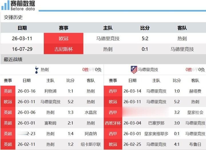 第一:两队情况!热刺目前联赛排名英超倒数第五,仅比降班赛区多1分,保级压力很大,队伍总身价8.03亿欧元;马竞目前联赛排名西甲第三,队伍总身价5.87亿欧元。上场对抗赛,热刺外场1-1绝平利物浦,艰难止住了各项对抗赛6连败;马竞本场比赛1-0小胜赫塔费,豪取足球赛事4连胜。