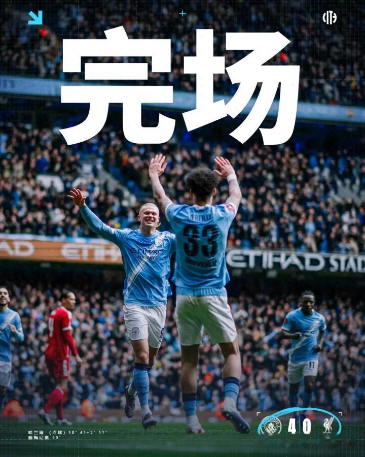 哈兰德,独中三元,曼城生涯第12次戴帽,追平阿圭罗。他只用了77分钟、3次射正。利物浦的防线在他面前像纸糊的城墙。这是他11次面对利物浦打进的第8球——场均0.73球,超过他对阵任何其他强队的效率。