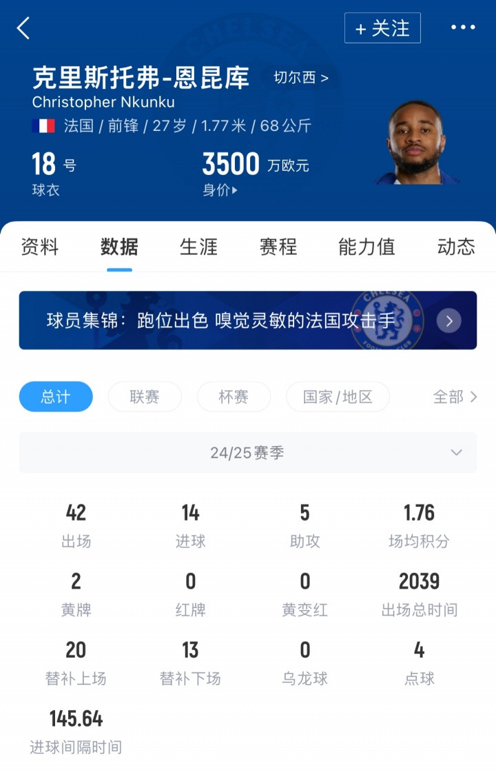 恩昆库于2023年夏天从莱比锡加盟切尔西,条约捏续至2029年。上赛季他在各项赛事中出场42次,攻入14球,但仅在英超联赛首发出场9次。