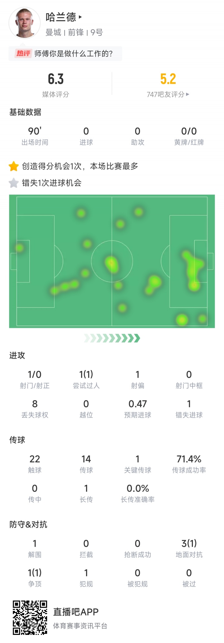 踢得难熬!哈兰德对阵热刺全场触球22次,连两队门将一半齐不到