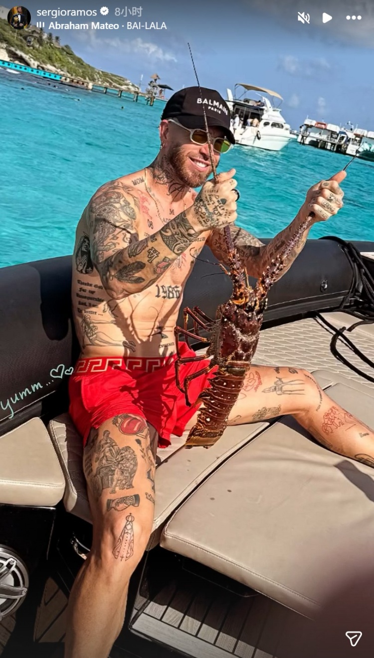 8月26日讯 拉莫斯在个东说念主社媒晒出我方假期失业的像片,并与拿获的龙虾合影。