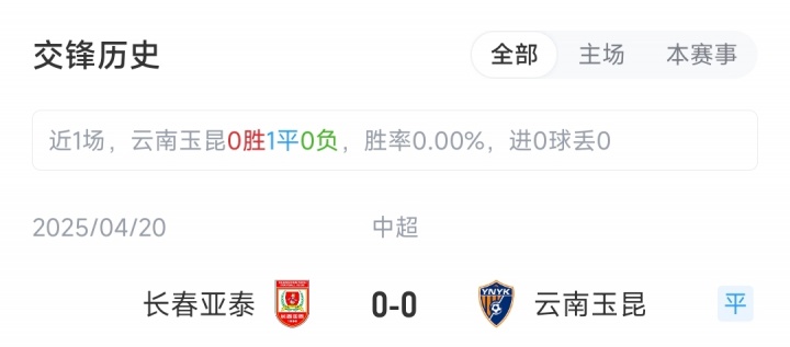 两两队过往仅有一次交手,本赛季中超第8轮,长春亚泰主场0-0战平云南玉昆。