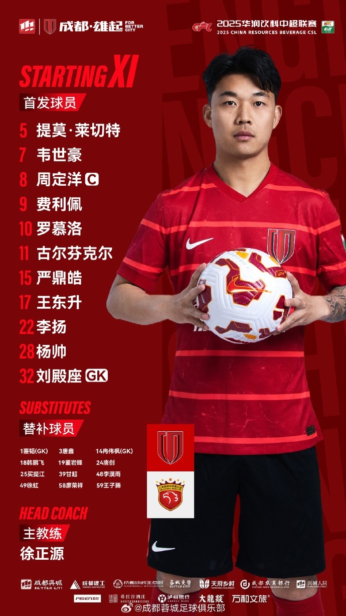 成齐蓉城vs上海海港比赛首发名单出炉!成齐,雄起!