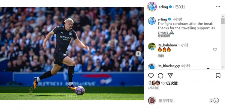 百场里程碑破门!哈兰德社媒:休赛期后战争陆续,感谢球迷的赈济