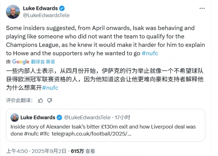 这家英国寰宇性报纸被觉得是逐日电讯报,逐日电讯报今夏捏续报说念伊萨克转会闹剧的纽卡跟队Luke Edwards今晨发帖示意,伊萨克从四月份起就阐扬得像不但愿球队取得欧冠经验相似。
