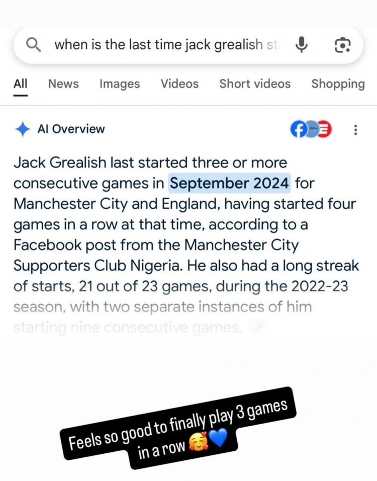 格拉利什通过社媒晒出了我方搜索我方前次谈论3场首发的信息,理会他前次谈论3场首发回是2024年9月。他对此点评谈:“终于又能谈论3场首发的嗅觉真棒!”