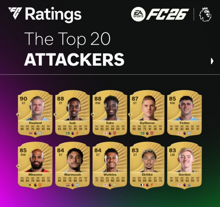 FC26官方英超挫折手评分榜:哈兰德90最高,伊萨克、萨卡88