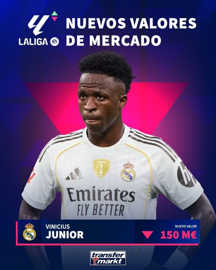 10月02日讯 德转今天发布了最新一期西甲身价更新,维尼修斯成为此次更新的焦点,他的身价从1.7亿欧下落到了1.5亿欧。