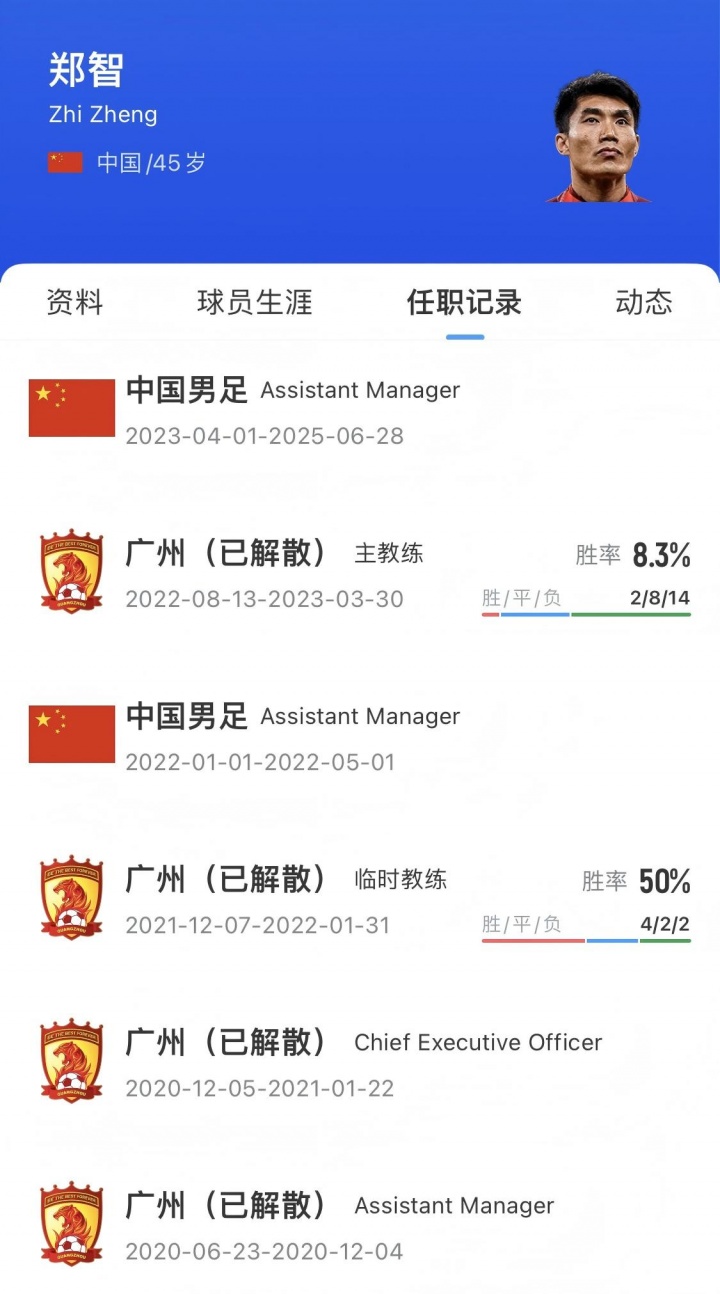 2002年12月,国足3-1打败叙利亚,22岁3个月17天的郑智演出了他在国足的首秀。2019年1月,亚洲杯1/4决赛,国足0-3不敌伊朗,38岁的郑智打满全场,完成了在国度队的终末一次出场。2022年1月,41岁的郑智出战广州队vs长春亚泰的中超比赛,这是他劳动生计终末一次出场。