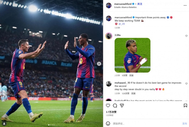 拉什福德社媒晒同莱万庆祝照:进犯的客场3分,咱们持续致力