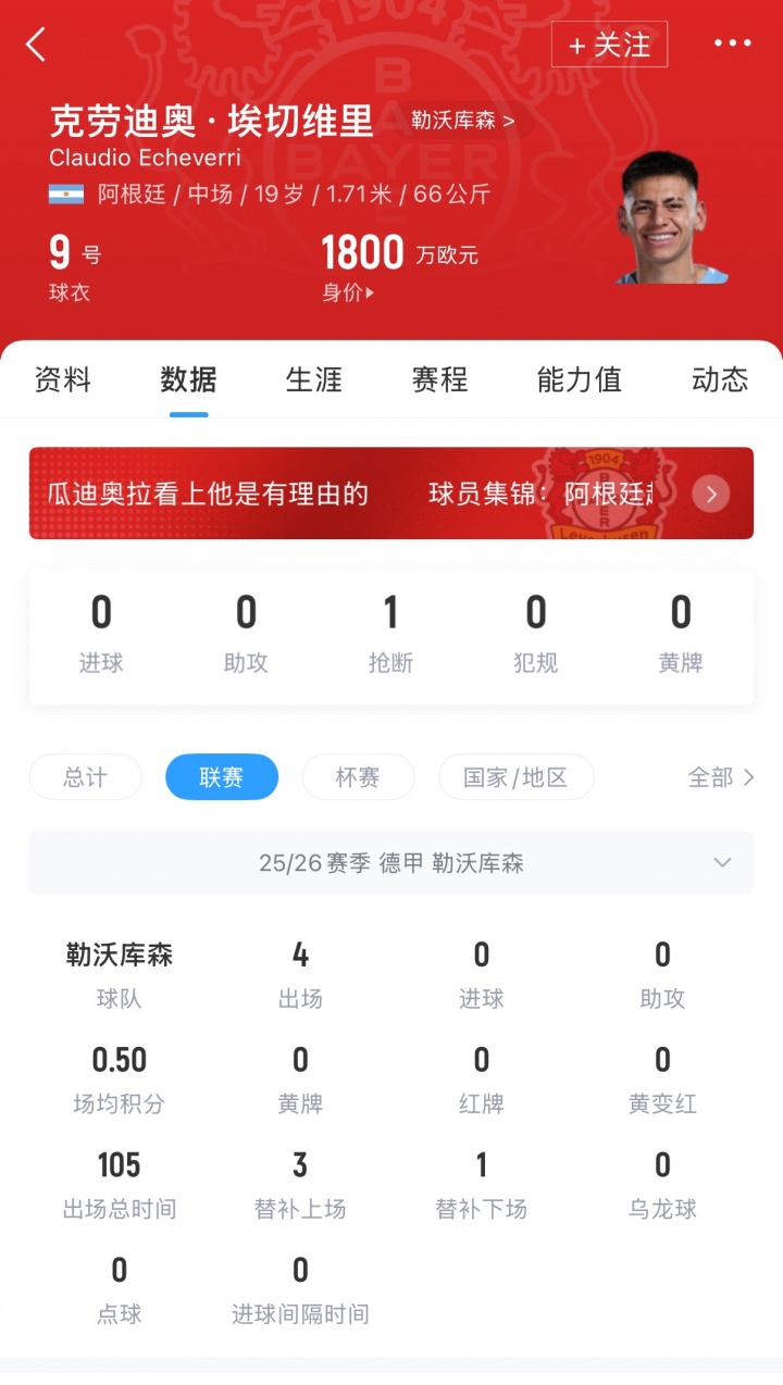 19岁的埃切维里在今夏租赁加盟药厂后,联赛仅出场4次,总本事仅105分钟,莫得获取进球或者助攻。