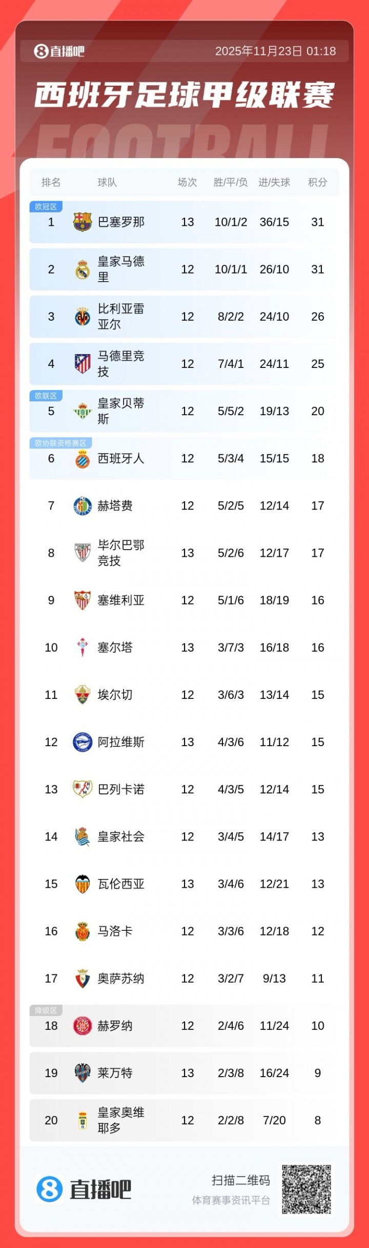西甲积分榜:巴萨三连胜暂升榜首,皇马来日凌晨客战埃尔切