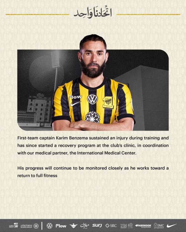 吉达勾搭官方:本泽马在检修中受伤,现在已为其启动康复权术